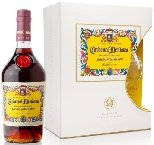 Descripción | Brandy Cardenal Mendoza Solera Gran Reserva con copa: Color caoba oscuro. Aroma redondo, limpio, elegante, vinoso. Equilibrado y persistente en boca, sin aristas, personalidad, armonÃa de matices y el recuerdo profundo a pasas y ciruelas. |